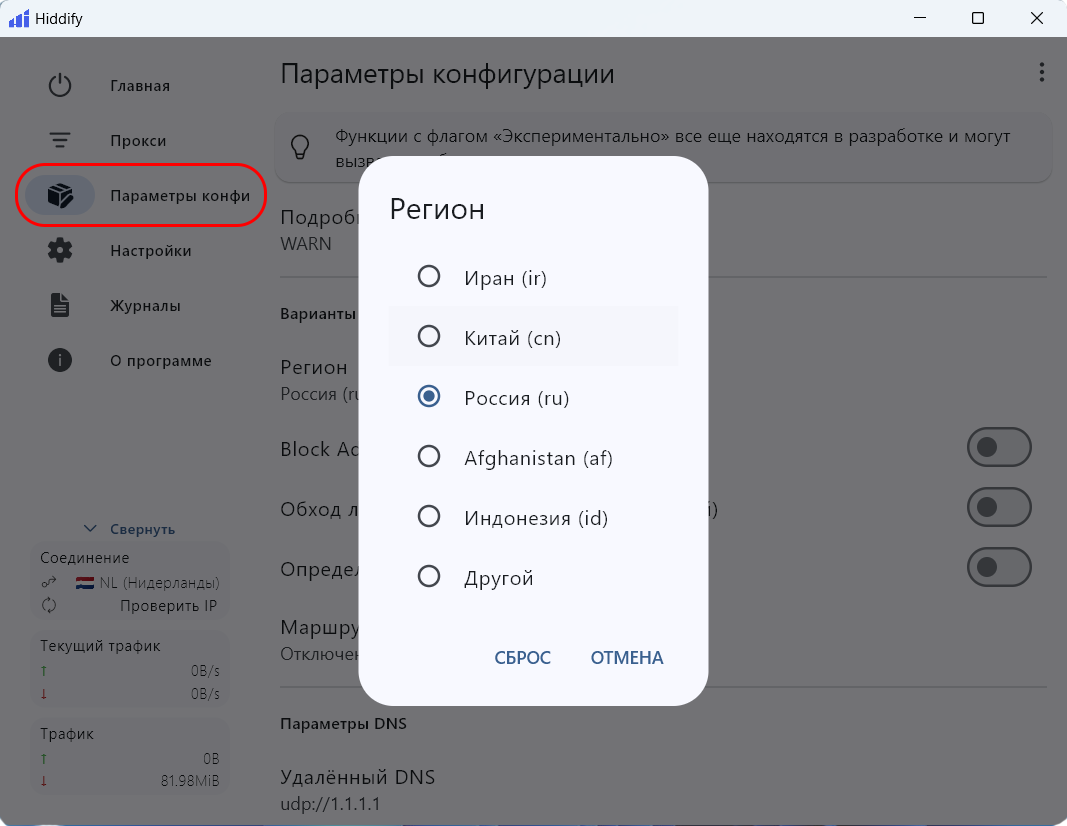 Hiddify позволяет настраивать роутинг подключения в зависимости от выбранного региона. К примеру, при выбранном регионе Россия все подключения к сайтам российского сегмента Интернета будут подключаться через Ваше прямое подключение, а заблокированные и зарубежные ресурсы — через VPN.