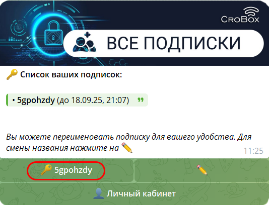 1) Перейдите в телеграм-бот на страницу Мои подписки и нажмите на кнопку с подпиской.